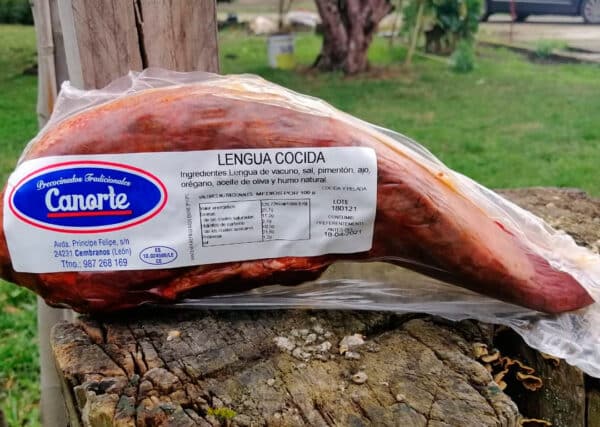 Lengua de vacuno adobada al estilo de Leon, curada, cocida y pelada.
